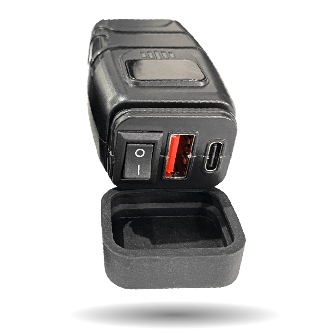 Cargador para moto con multímetro integrado, ideal para monitorear el voltaje de la batería en tiempo real. Cuenta con puertos USB y Tipo C de carga rápida, permitiendo recargar dispositivos de forma segura durante tus recorridos.